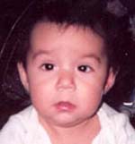 Noah Leano, 18 months old. He's wearing a 1 piece red jumper.