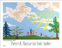 The poster, titled "Do You See What I See," is an 18 x 21 inch print of a paper cut-out depicting children looking for images in clouds. Mr. Matisse, who has helped many organizations with fundraising activities, sees CodeAmber as the organization that CAN make a difference in the Amber Alert system. He expresses his dismay that children are targets. "In my day, children played freely, adults were there to help, not hurt, and children were always looked after. Now it seems they live in fear of strangers and adults, and that should never be."