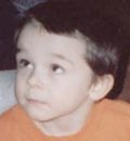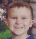 Tyler Jacob Skief, 4 yrs., with green eyes, brown hair, wearing tan shorts, blue Hawaiian shirt.